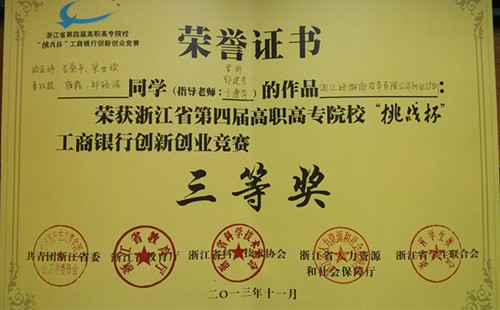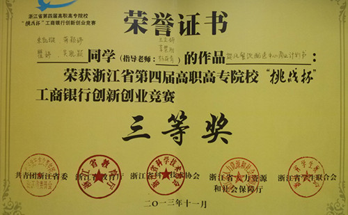 热烈祝贺我院学生所作的《旋风餐饮配送中心商业计划书》和《浙江妍御尚皮革有限公司创业计划》分别荣获浙江省第四届高职高专院校“挑战杯”工商银行创新创业竞赛“三等奖”。(院团委供稿)