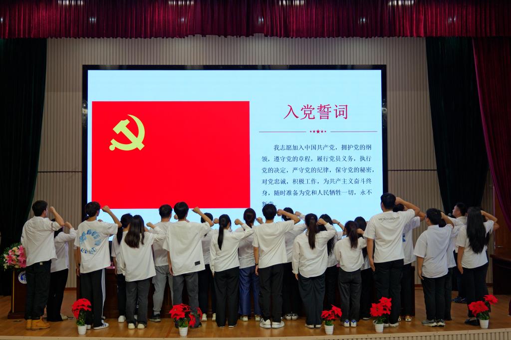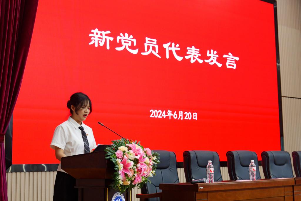 随后,进行了新党员代表入党宣誓仪式。面对鲜红的党旗,24名新党员代表举起右手,庄严宣誓“为共产主义奋斗终身”!宣誓完毕后,建筑工程学院的车丹丹同学作为新党员代表进行了表态发言。