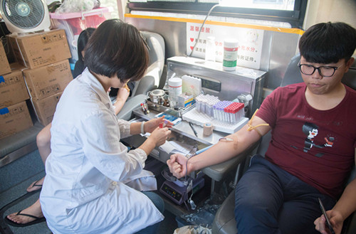 活动现场氛围热烈有序,广大师生首先要详细阅读献血知识宣传册再登记进行体检,体检合格者才能到献血车上去献血,献血完毕休息30分钟后领取献血证。