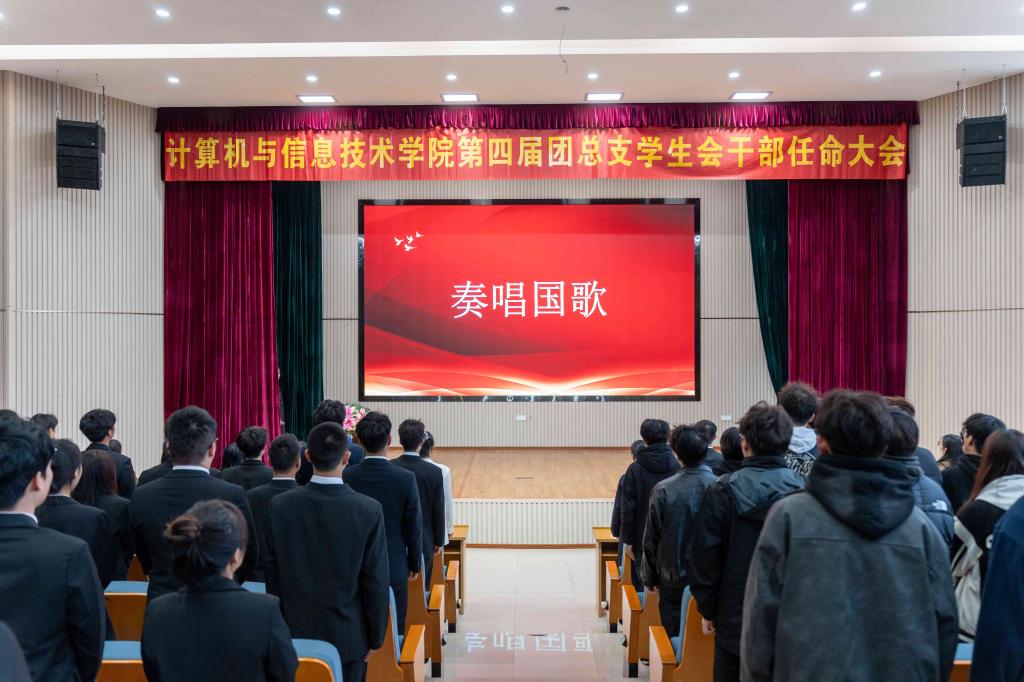 为贯彻落实习近平总书记关于青年工作的重要思想,深化团学组织改革、强化团学组织示范引领作用。近日,计算机与信息技术学院在第二报告厅举行第四届团总支学生会干部任命大会。学院党总支书记徐静、副书记刘帅、学工办副主任华春媛、全体辅导员、学生代表共计200余人参加此次大会。会议由学工办副主任林美娜主持。